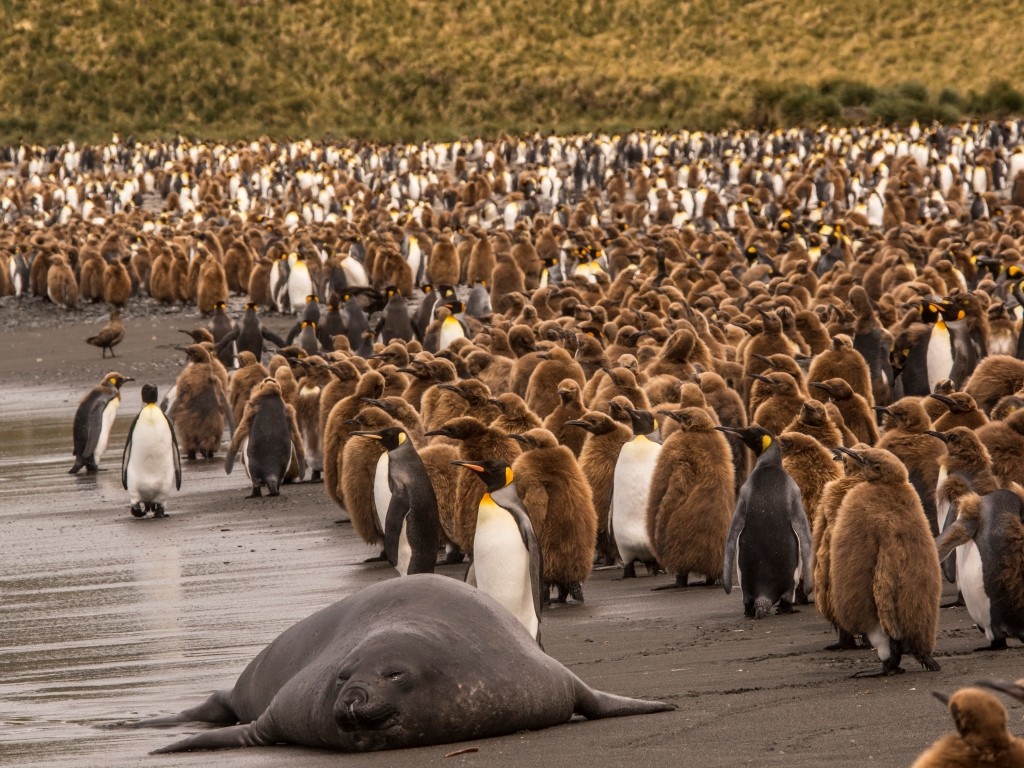 Next stop was South Georgia Island, the diamond in the Southern Ocean’s crown jewels of Sub-Antarctic islands, a spectacular glaciated landscape home to some of the greatest wildlife densities found anywhere on earth. Ty will take us ashore to visit the huge Fur Seal Colonies and to witness the titanic struggle between bull Elephant Seals, each battling to become beach-master. We will visit King Penguin colonies numbering 335,000 pairs or more. We’ll see and hear their struggles to survive in a challenging climate, where some of the roughest seas in the world meet. This island, just 100 miles long and with 100 million birds, is the most wildlife-rich island on the planet!