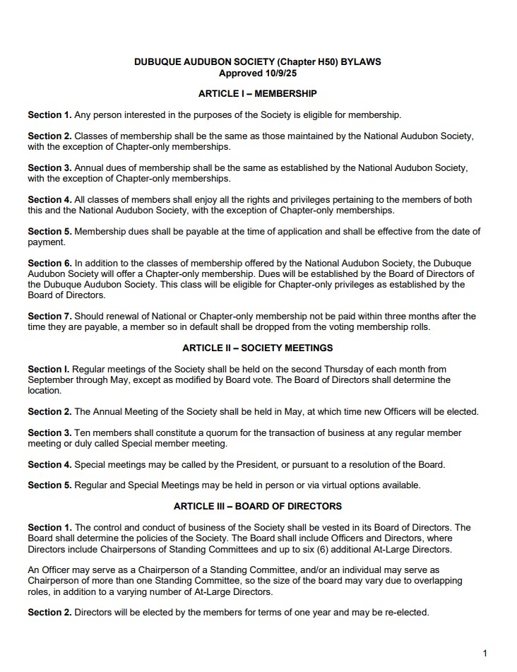 The Dubuque Bird Club became the Dubuque Audubon Society on January 11, 1973, becoming a charter member of the National Audubon Society.
